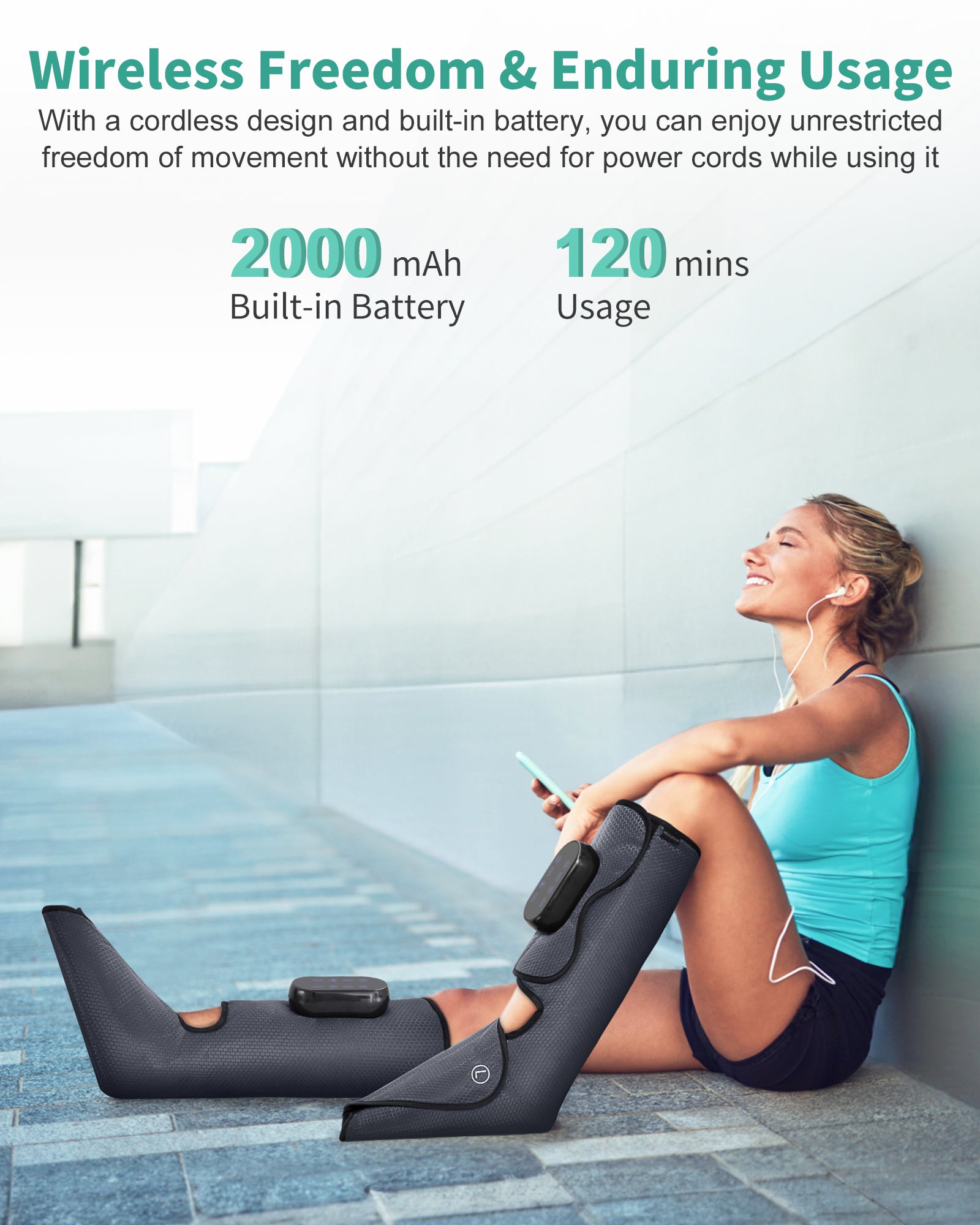 - Wireless Rechargeable Leg Massager This wireless leg massager, designed for cable-free operation and effortless mobility. No need for power outlets or untangling wires. It is ideal for muscle relaxation, fatigue reduction, especially for post-exercise recovery. Its portability, once fully charged with the supplied Type-C cable, allows you to use it freely anywhere, including the gym, park, home, or office. Each leg can be used independently.